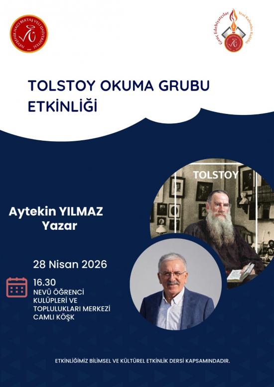 Etkinliğin ikinci aşaması saat 16:30’da NEVÜ Öğrenci Kulüpleri ve Toplulukları Merkezi Camlı Köşk’te devam edecektir. “Tolstoy Okuma Grubu” başlıklı bu etkinlik ile katılımcıların birlikte okuma ve tartışma yoluyla Tolstoy’un eserlerini daha derinlikli bir şekilde anlamalarını hedefleyen kolektif bir öğrenme ortamı sunmak amaçlamaktadır. Bu etkinlik, ilerleyen dönemde çevrimiçi olarak devam ettirilmesi planlanan toplantılar için bir ilk buluşma niteliğinde olacaktır. Katılımcıların birbirlerini tanımaları, okuma sürecine dair beklenti ve yöntemlerin paylaşılması ve grubun işleyişine ilişkin temel çerçevenin belirlenmesi hedeflenmektedir.